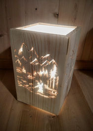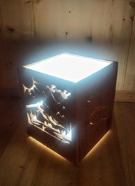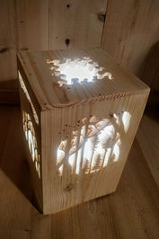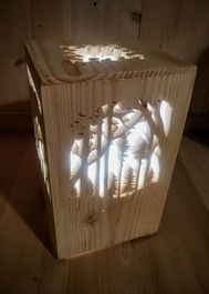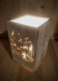Selon vos envies et selon la surface de découpe les lampes peuvent être équipées de plexiglass opaque pour une lumière plus diffuse, le "toit" de la lampe peut être ouvert, en plexiglass, ou en bois découpé.